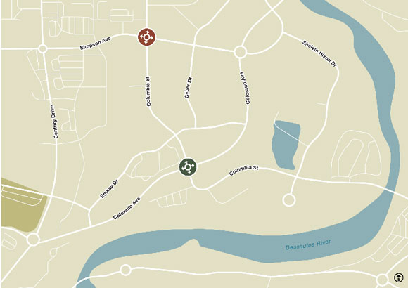 - SW Simpson – Columbia intersection – Closed for Roundabout construction through August. Full closure of intersection with detour. For further information, visit www.bendoregon.gov/Columbia-roundabouts.